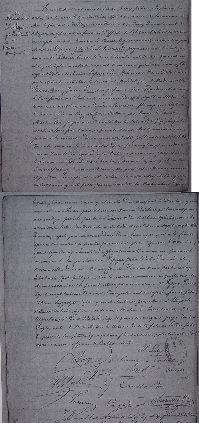L'an mil huit cent treize et le huitième jour du mois de novembre à six heures de l'après midy, pardevant nous Henry Bonnet Maire d'Ambialet et officier de l'état civil, ont comparu pour contracter mariage, jean pierre Chamayou propriétaire majeur né le vingt huit janvier l'an mil sept cent quatre vingt trois ainsi qu'il résulte de l'acte de naissance délivré par le maire de la commune de Curvale, fils d'andré Chamayou et de Marie Anne Bayle, mariés, propriétaires demeurant avec ses père et mère à la ramondié commune de Gaicre, canton de Valence, procédant le dit jean pierre Chamayou en présence et du consentement de sons père d'une part; Et anne Calvet née le cinq juillet de l'an mil sept cents quatre vingts quatre ainsi qu'il résulter de l'acte de naissance délivré par le maire de la commune de Courris, canton de Valence déposé aux archives de cette mairie, majeure fille de pierre Calvet propriétaire et de feue marie anne puech mariés, domiciliée avec son père à la Bouryié, commune d'Ambialet, procédant ladite Calvet en présence et du consentement de son père d'autre part ; lesquelles parties contractantes nous ont requis de procéder à la célébration du mariage projeté entre elles et dont les publications ont été faites à la mairie de gaycre les dimanches vingt quatre et trente un octobre dernier à neuf heures du matin et à la mairie d'Ambialet les dimanches dix sept et vingt quatre du même mois susdit an, sans qu'il soit intervenu aucune opposition a l'accomplissement du présent mariage et de suite faisant droit aux réquisition des parties, muni de toutes les pièces probantes pour la déclaration de l'acte, desquelles il a été donné lecture, ainsi que du chapitre six du code napoléon, titre cinq du mariage, nous avons demandé au futur époux et à la future épouse s'ils veulent se prendre pour Mary et pour femme : chacun d'exu ayant répondu individuellement et affirmativement, nous déclarons au nom de la loy que jean pierre Chamayou et Anne Calvet sont unis par le mariage de tout quoi nous avons dressé acte en présence de Louis Payrastre propriétaire au fraille, d'antoine Reveille (?) meunier à Cambou du temple (?), de Joseph Carayon et de Baptiste Carayon domestiques au Bez tous domiciliés dans la commune d'Ambialet témoins majeurs produits par les parties interpellées, auxquels il a été donné lecture du présent acte et ont signé avec nous les dits andré Chamayou, Reveille et Payrastre, non les autres témoins le dit Calvet et les époux, lesquels requis de signer ont déclaré ne savoir.